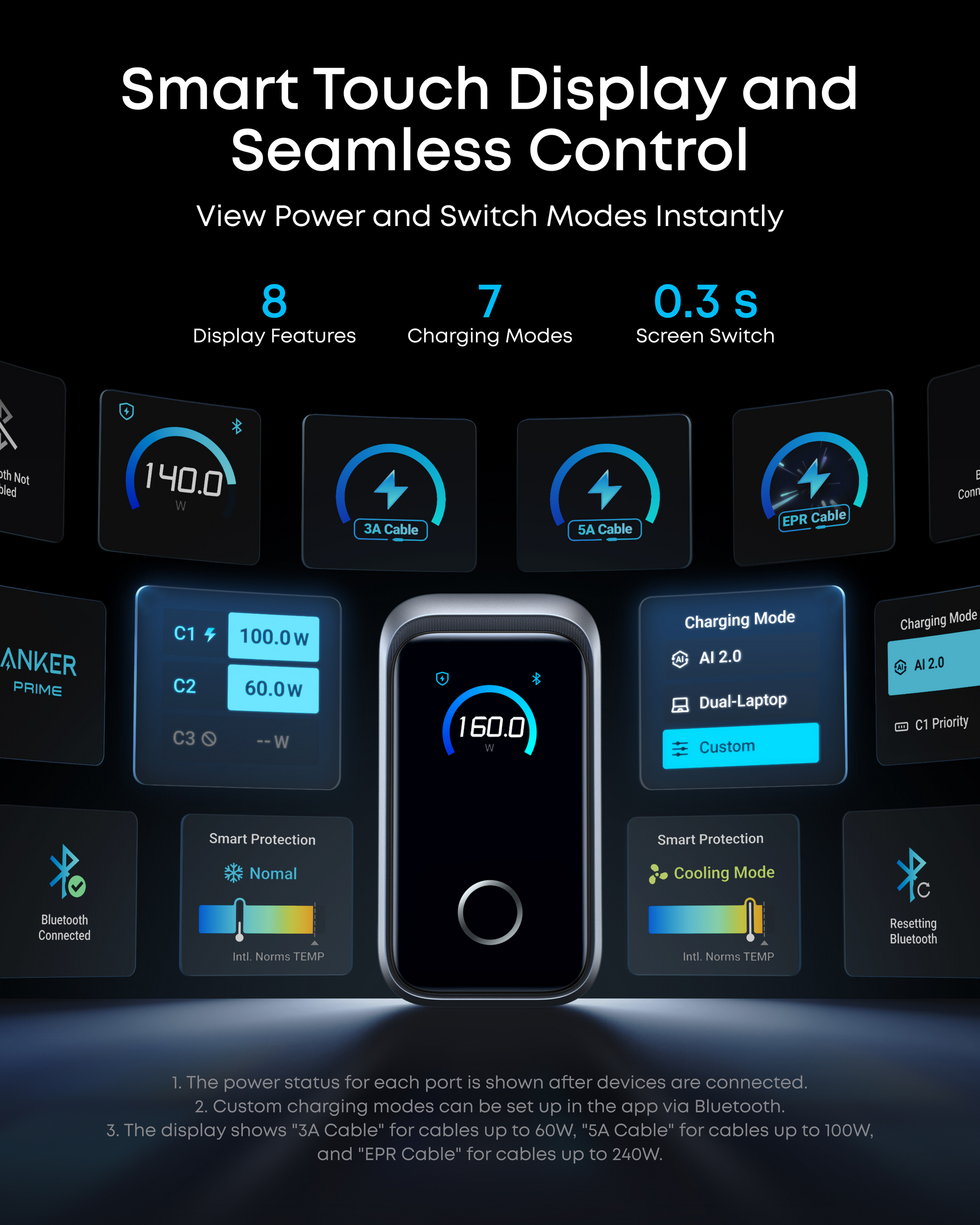 - Smarter Charging Control: With AnkerSense View, monitor power in real time on screen, switch modes instantly, and unlock custom modes through the app via Bluetooth.