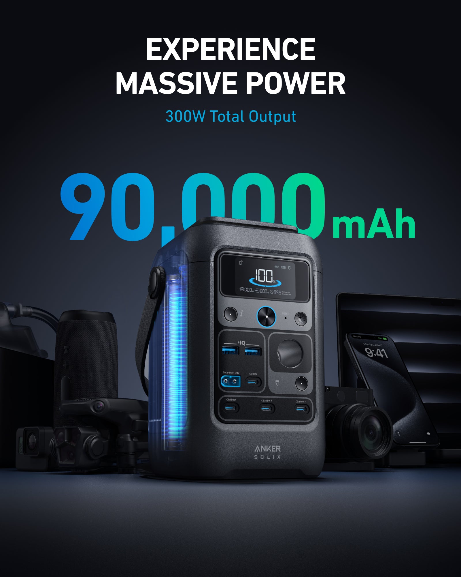 This 90,000mAh (288Wh) battery delivers 300W and includes two 140W two-way USB-C fast charging ports.