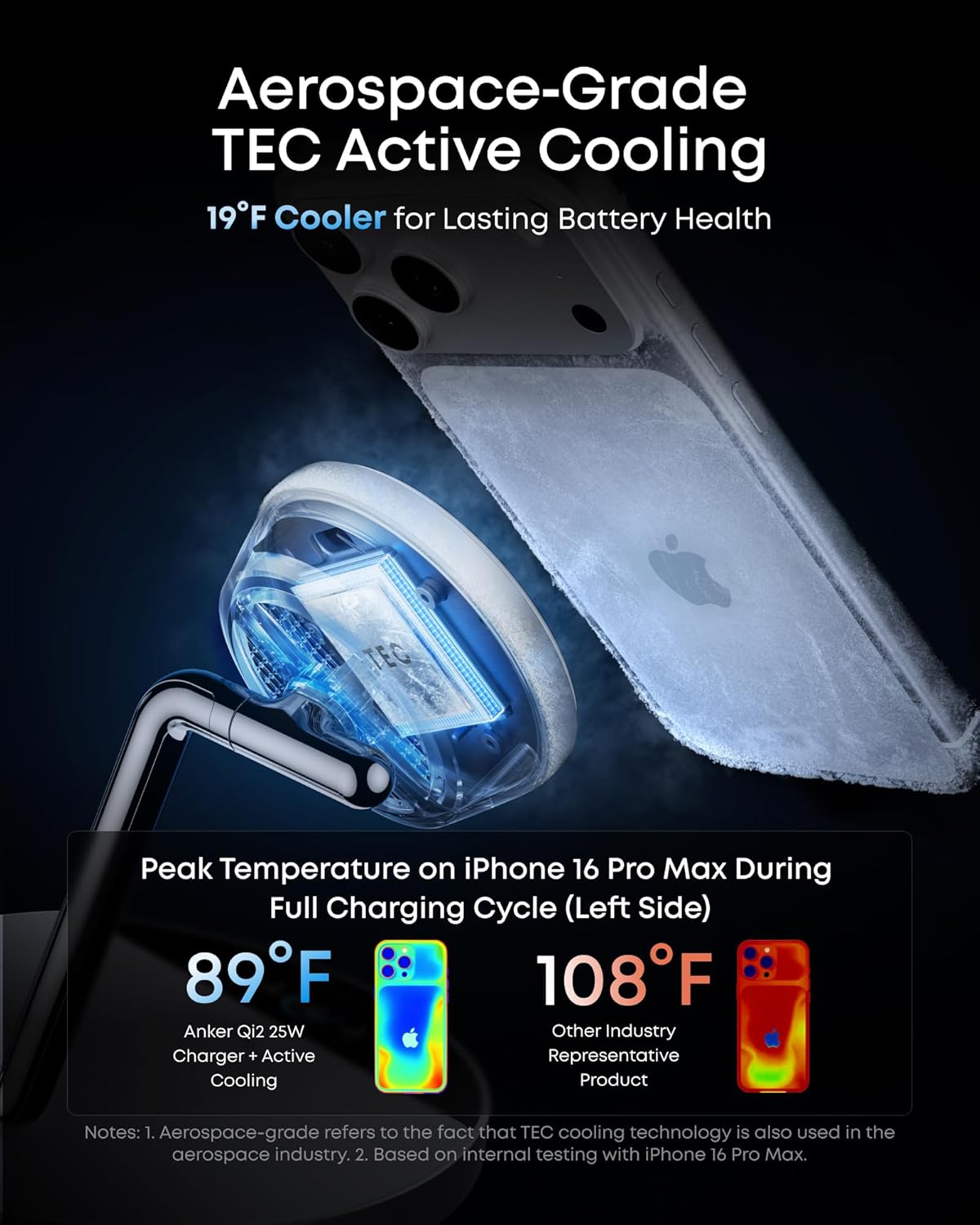 Aerospace-Grade TEC Active Cooling: Thanks to TEC active cooling, your phone stays below 89°F while charging, providing a safe, efficient, and comfortable experience. Lower temperatures help protect your battery's health and reduce long-term degradation. Actual performance may vary.