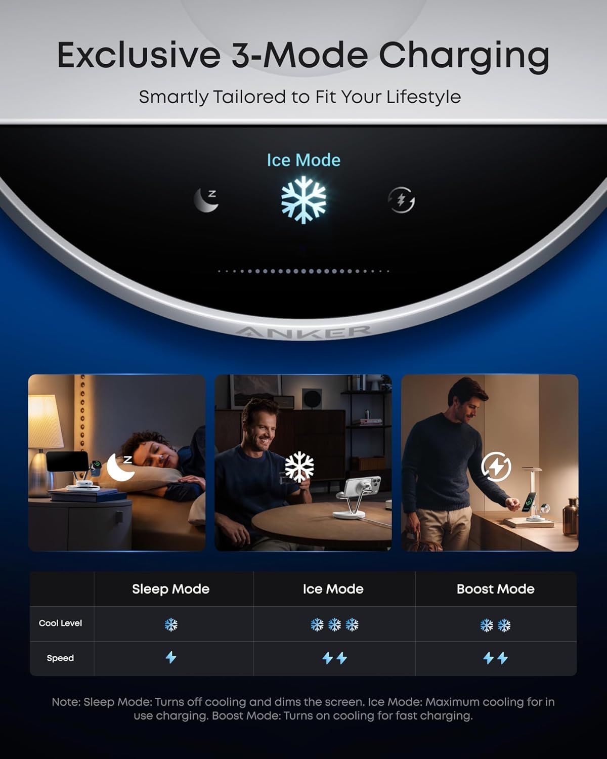 3 Modes for All-Day Power: Switch between 3 smart charging modes to match your daily routine. Boost Mode delivers high-power charging to keep your phone cool during quick top-ups. Ice Mode provides maximum cooling with rapid charging performance, ideal for charging while in use. Sleep Mode turns off cooling and dims the display for quiet overnight charging.